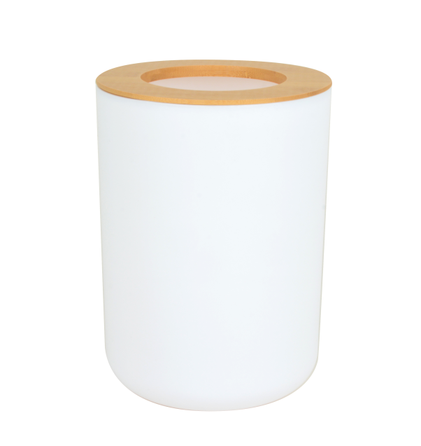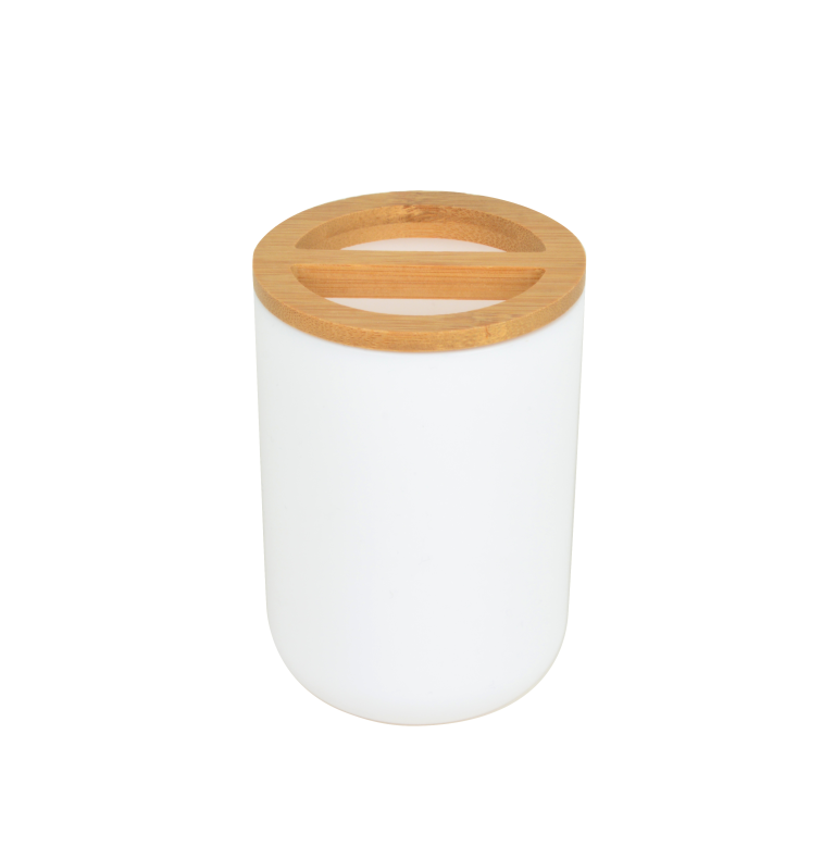 The set of 6 white bamboo bathroom accessories includes a Lotion Bottle, a Toothbrush Holder, a Rinse Cup, a Soap Dish, a Toilet Brush, and a Trash Can. This bathroom basic organizer kit helps you decorate your restroom properly while saving precious space.