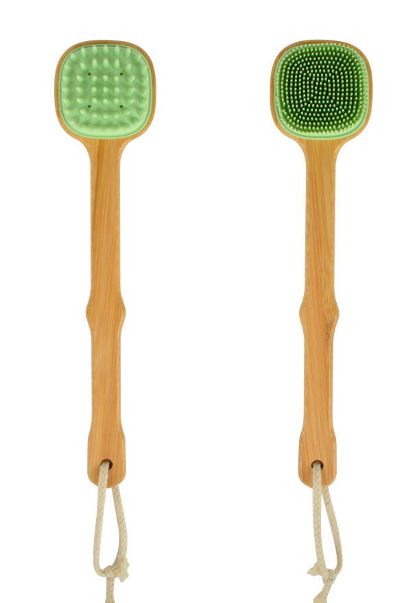 Crafted with a smooth, sturdy bamboo handle and a dual-sided soft green silicone head, this bath brush ensures a comfortable grip and long-lasting use. The bamboo handle boasts a natural texture, while the flexible silicone bristles feature two distinct patterns, merging eco-friendly material with practical functionality.