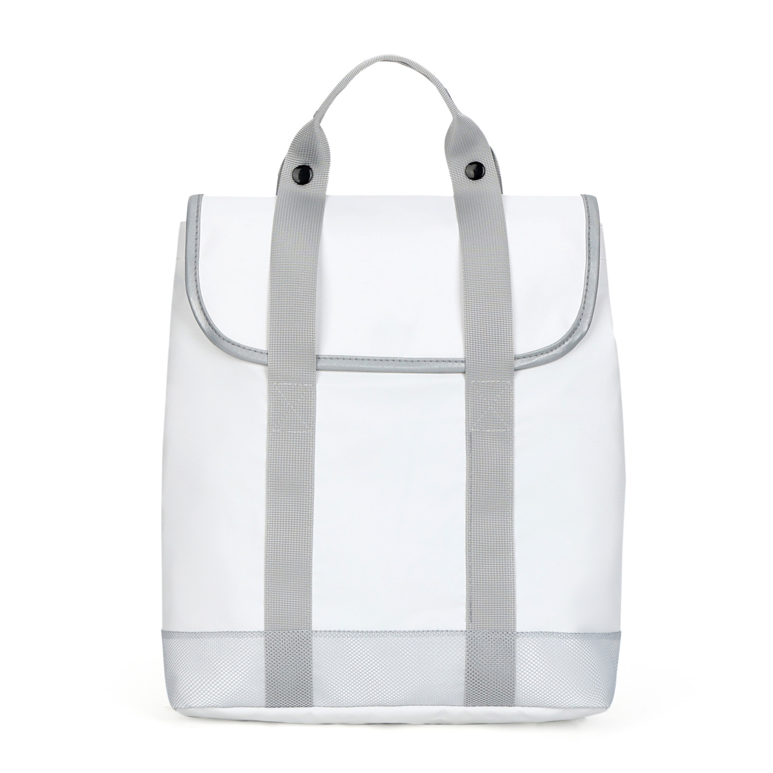 This stylish backpack is made of 600D Oxford fabric, featuring a sleek white design with gray accents. It comes with a top handle and adjustable straps, suitable for daily use, school, or casual outings. Durable and practical, it offers ample storage space and a modern look.