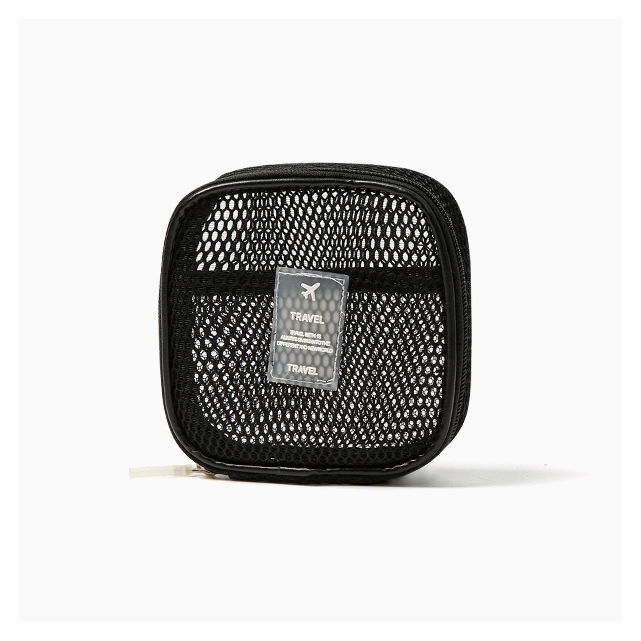 Lightweight black mesh cosmetics pouch made of polyester. Breathable design prevents clutter, easy to slip into any handbag.