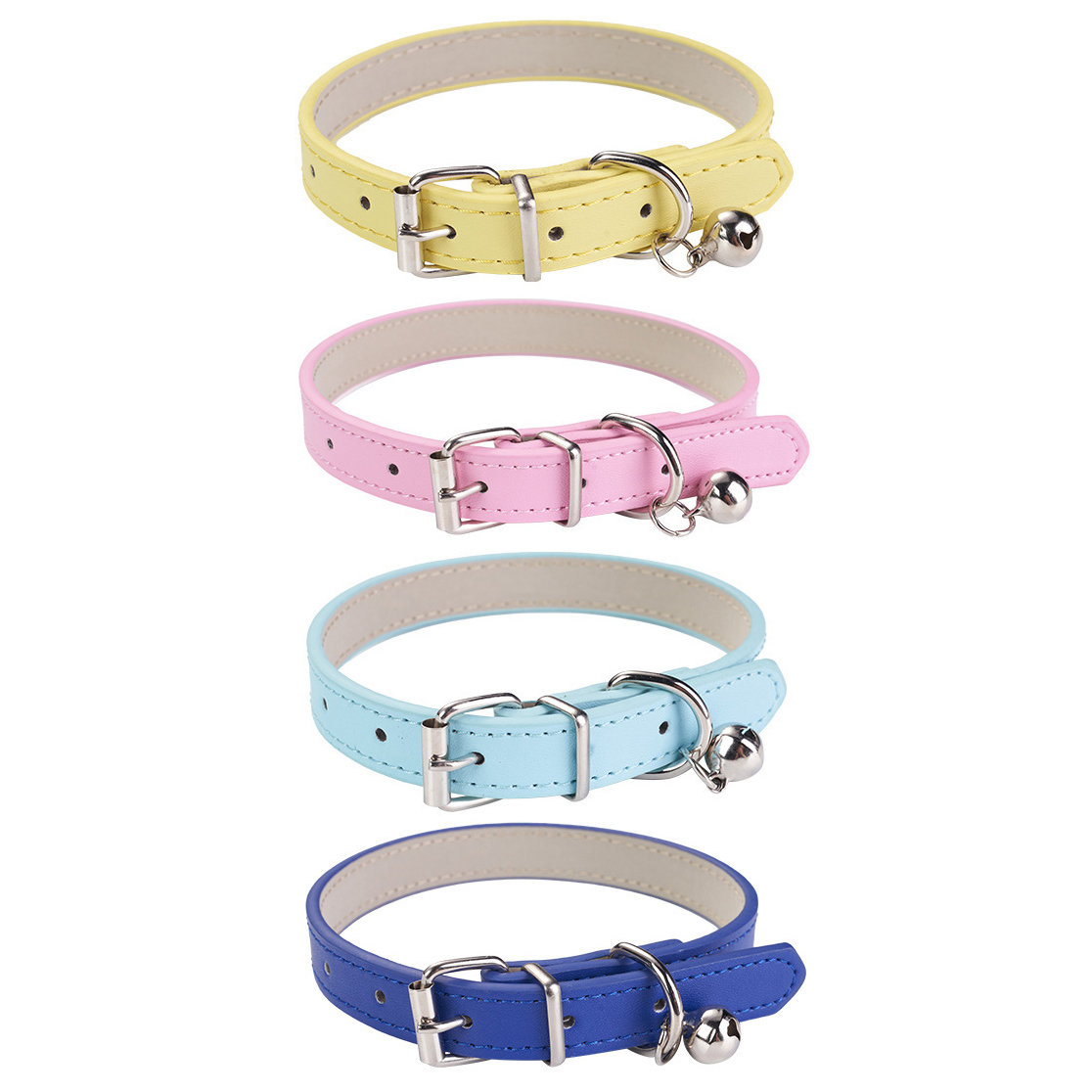 This pet collar comes in vibrant colors (yellow, pink, light blue, blue) with a soft leather construction, a metal buckle, and a bell for added functionality. The adjustable design ensures a comfortable fit for cats and small dogs, making it a stylish and practical accessory for everyday use, with the bell helping locate your pet during play or walks.