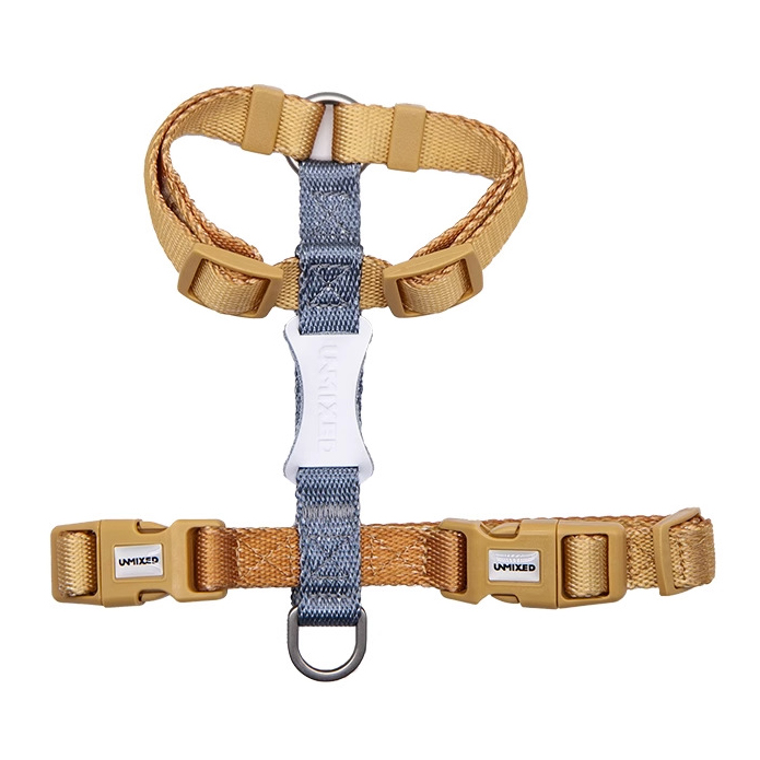 This U-MIXED pet harness features a durable nylon construction with a dual-tone design (tan and gray), adjustable straps, and secure buckles for a comfortable, custom fit. Ideal for cats and small dogs, it ensures safety and control during walks with its sturdy metal D-ring, combining functionality and style for pet owners.