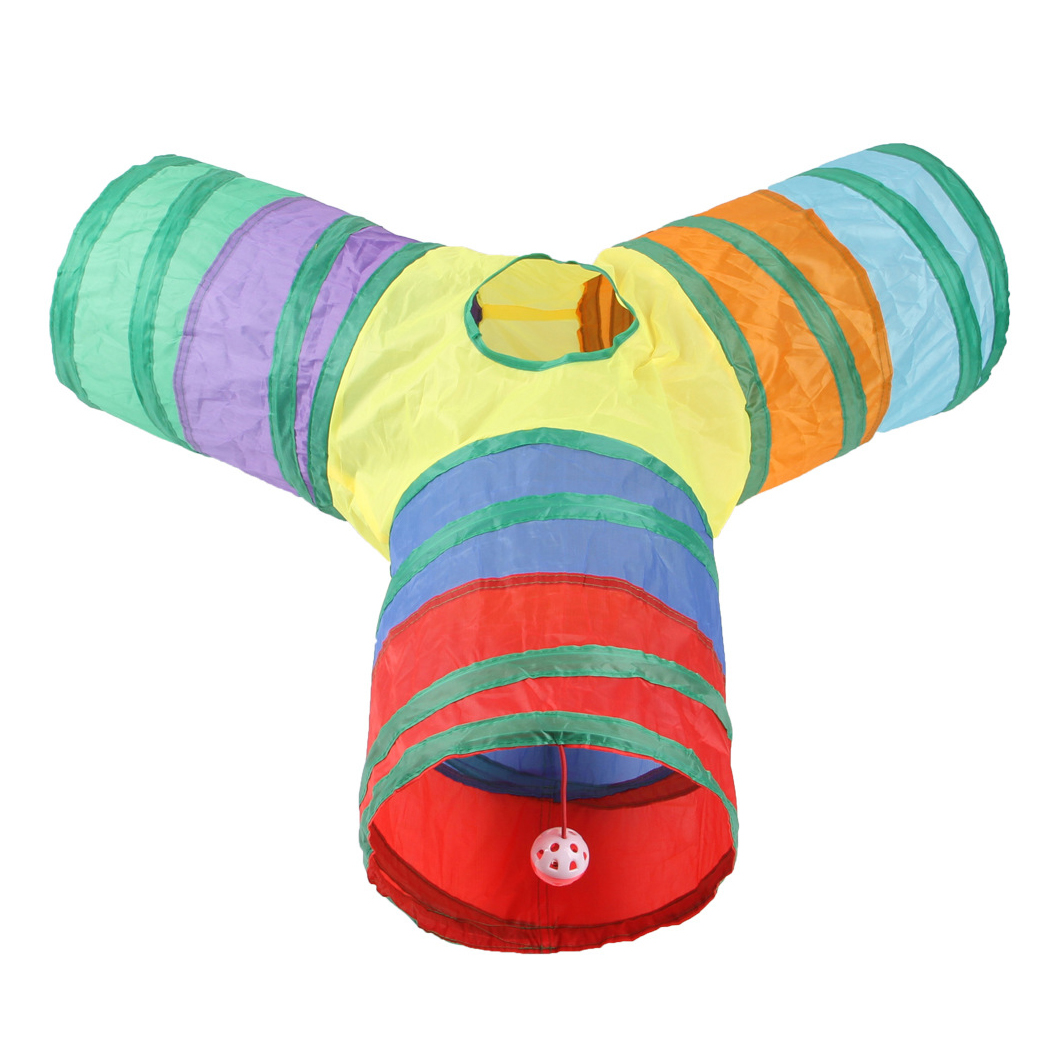 Collapsible Y-shaped rainbow cat tunnel—ideal for feline play and easy storage. It has 3 openings for chasing, hiding, and pouncing, and folds flat to save space when not in use.